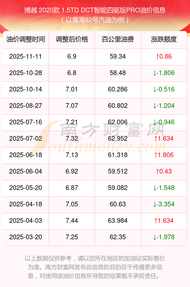 按11月11日92號汽油最新調(diào)整價格6.9元每升來計算(以青海為例),該車型百公里平均油費為59.34元,按上一輪10月28日調(diào)整價格6.8元每升來計算,百公里平均油費為58.48元,對比上一輪多花0.86元,下一輪油價調(diào)整時間為11月24日24時。