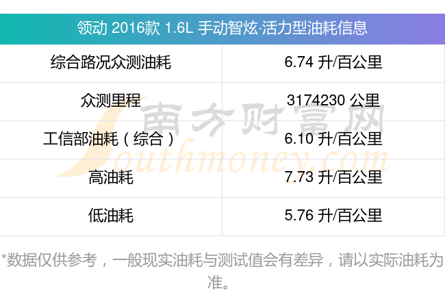 根據(jù)多位車主實測得出數(shù)據(jù),該車型低油耗為5.76升每百公里,高油耗為7.73升每百公里,綜合路況眾測油耗為6.74升每百公里,工信部綜合油耗為6.10升每百公里。
