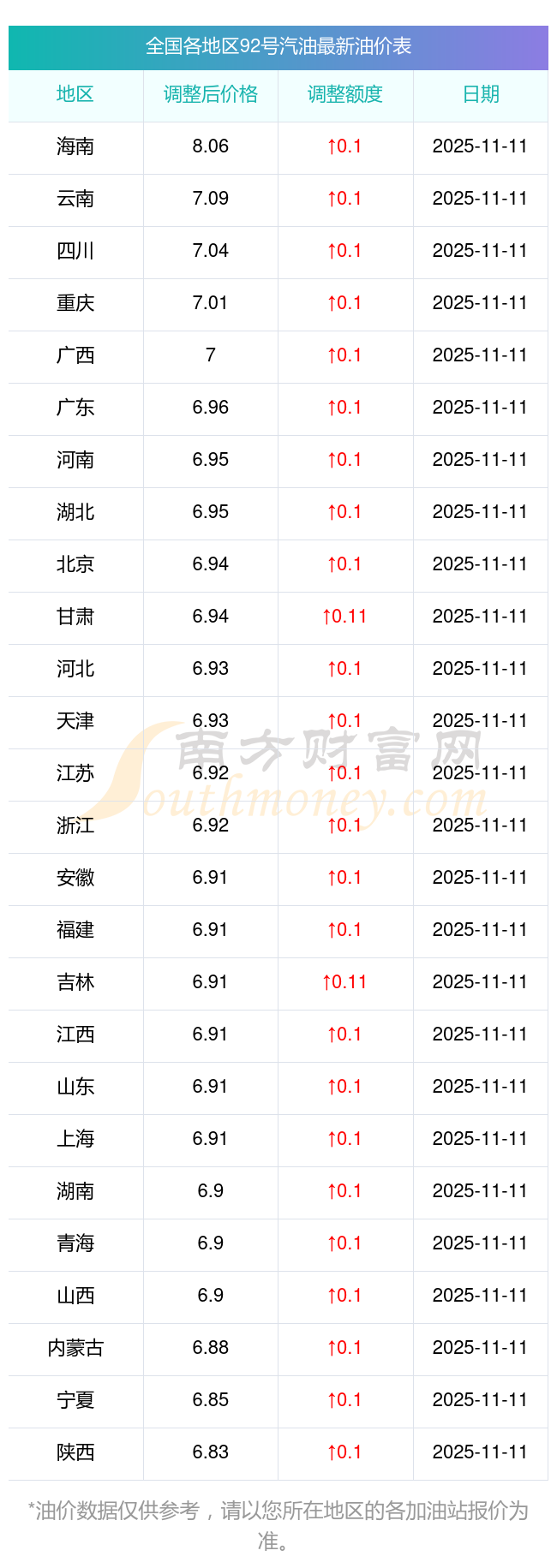 油價(jià)數(shù)據(jù)僅供參考,請以您所在地區(qū)的各加油站報(bào)價(jià)為準(zhǔn)。