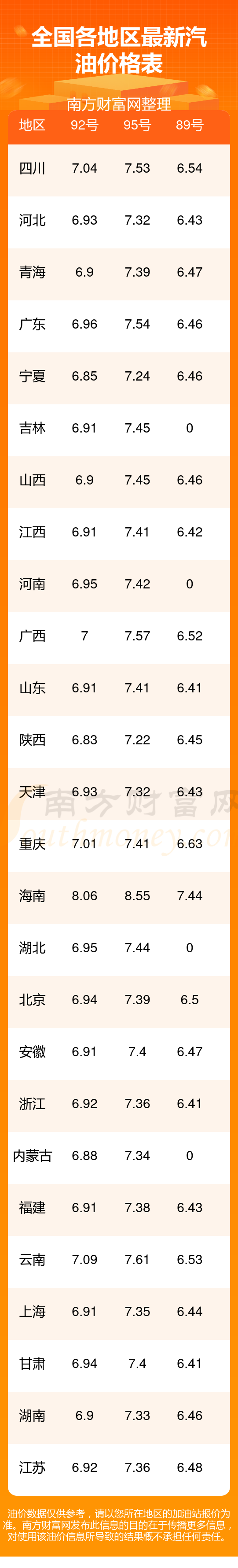 本次油價(jià)的調(diào)整時(shí)間為11月11日,調(diào)整后全國(guó)油價(jià)詳情為:92號(hào)汽油平均價(jià)格為7元每升,其中,最低的是陜西,6.83元每升,最高的是海南,8.06元每升。95號(hào)汽油平均價(jià)格為7元每升,其中,最低的是陜西,7.22元每升,最高的是海南,8.55元每升。0號(hào)柴油平均價(jià)格為:7元每升,其中,最低的是內(nèi)蒙古,6.46元每升,最高的是海南,6.67元每升。89號(hào)汽油平均價(jià)格為7元每升,其中,最低的是浙江,6.41元每升,最高的是海南,7.44元每升。,下一輪油價(jià)調(diào)整時(shí)間11月24日24時(shí),距離現(xiàn)在還有12.86天。