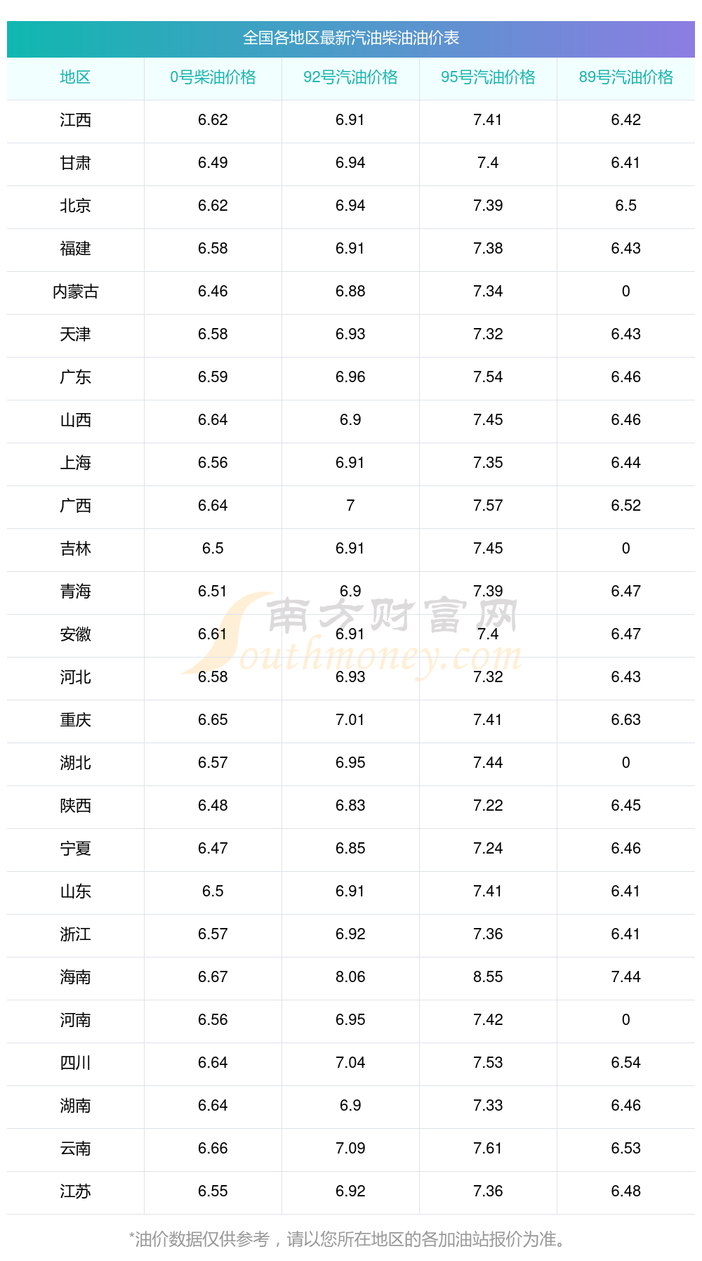 2025年全國各地區(qū)最新油價(jià)表
