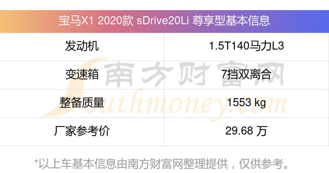 寶馬X1 2020款 sDrive20Li 尊享型動(dòng)力方面,搭載的是一臺(tái)1.5T140馬力L3渦輪增壓發(fā)動(dòng)機(jī),匹配7擋雙離合自動(dòng)檔變速箱,燃料形式為汽油,常規(guī)整備質(zhì)量1553kg,廠家參考價(jià)29.68萬(wàn)元。