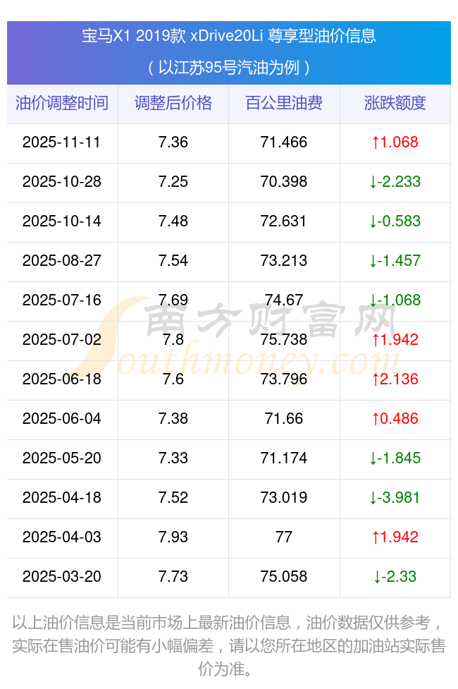 寶馬X1 2020款 sDrive20Li 尊享型具體油耗究竟是多少?(11月12日)92號(hào)95號(hào)98號(hào)汽油價(jià)格查詢(xún)