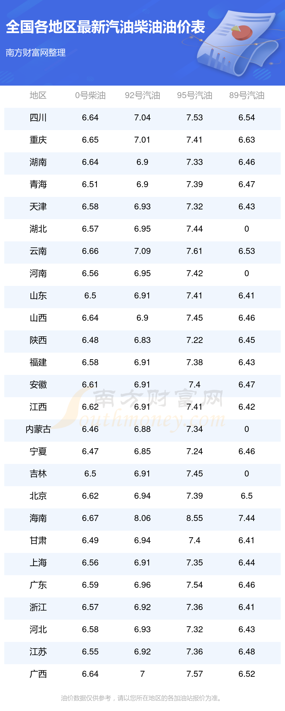 95號汽油平均價格:7元每升,其中,最高為海南,價格為8.55元/升,最低為陜西,價格為7.22元/升。