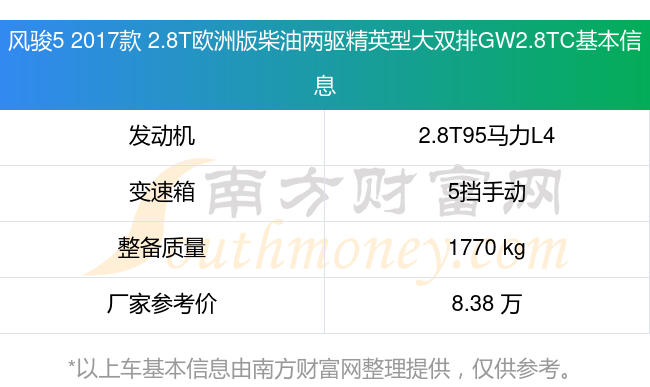 在動(dòng)力上,風(fēng)駿5 2017款 2.8T歐洲版柴油兩驅(qū)精英型大雙排GW2.8TC配備的是一臺(tái)2.8T95馬力L4渦輪增壓發(fā)動(dòng)機(jī),匹配的是5擋手動(dòng)擋變速箱,燃料形式為柴油,常規(guī)整備質(zhì)量1770kg,廠家參考價(jià)8.38萬元。