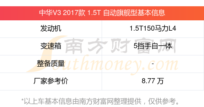 在動力上,中華V3 2017款 1.5T 自動旗艦型配備的是一臺1.5T150馬力L4渦輪增壓發(fā)動機,匹配的是5擋手自一體自動檔變速箱,燃料形式為汽油,廠家參考價8.77萬元。