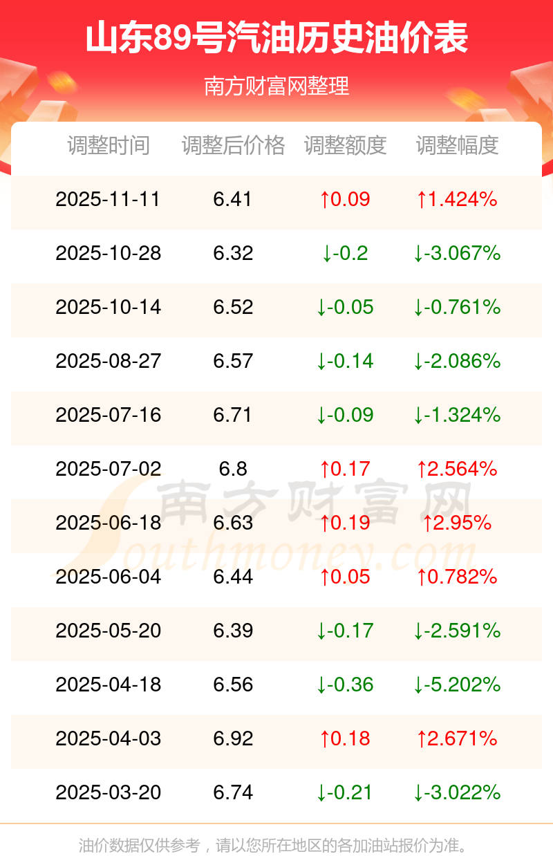 11月12日,山東89號(hào)汽油的價(jià)格是6.41元每升,本次的調(diào)整時(shí)間為11月11日,對(duì)比上次的調(diào)整增了0.09元,增1.424%,11月24日24時(shí)為下一輪油價(jià)調(diào)整時(shí)間,還有12.72天。