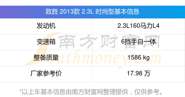 致勝 2013款 2.3L 時(shí)尚型動(dòng)力方面,搭載的是一臺(tái)2.3L160馬力L4自然吸氣發(fā)動(dòng)機(jī),匹配6擋手自一體自動(dòng)檔變速箱,燃料形式為汽油,常規(guī)整備質(zhì)量1586kg,廠家參考價(jià)17.98萬元。