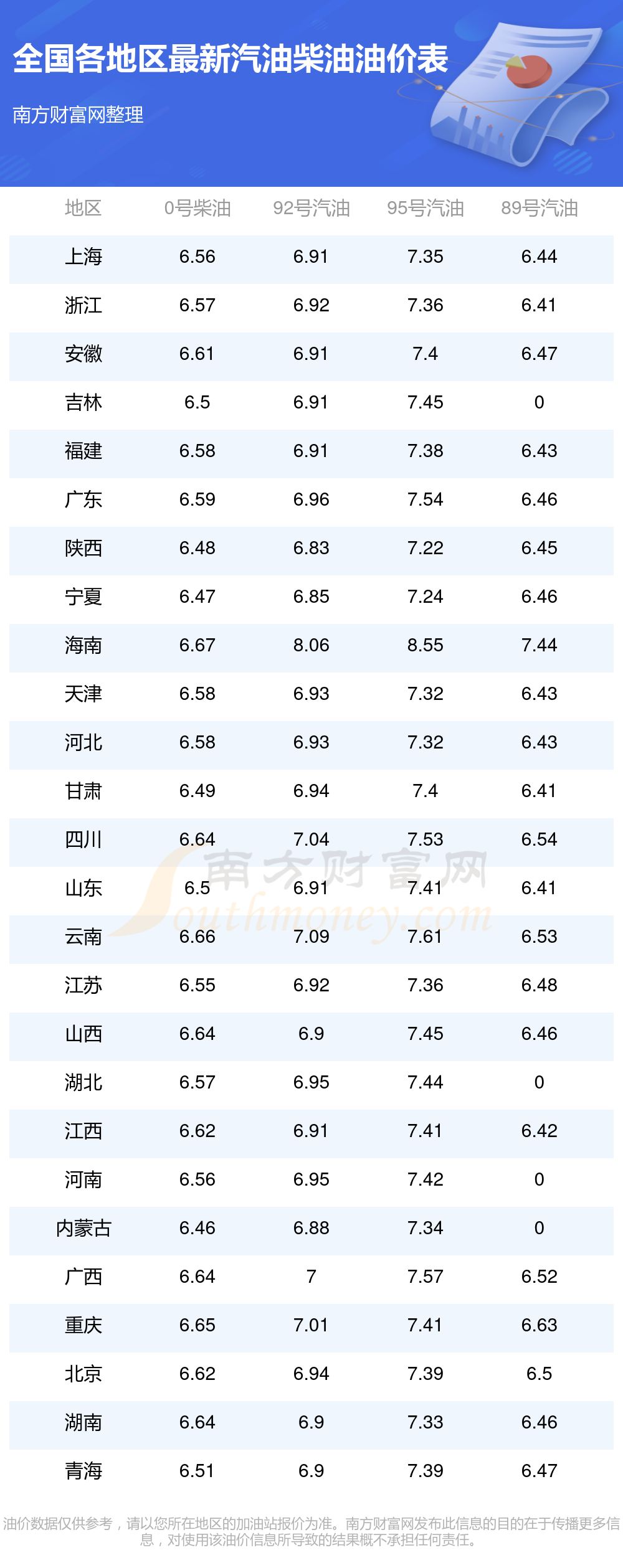 以上數(shù)據(jù)僅供參考,請以您所在地區(qū)的加油站實際售價為準(zhǔn)。南方財富網(wǎng)發(fā)布此信息的目的在于傳播更多信息,對使用該油價信息所導(dǎo)致的結(jié)果概不承擔(dān)責(zé)任。