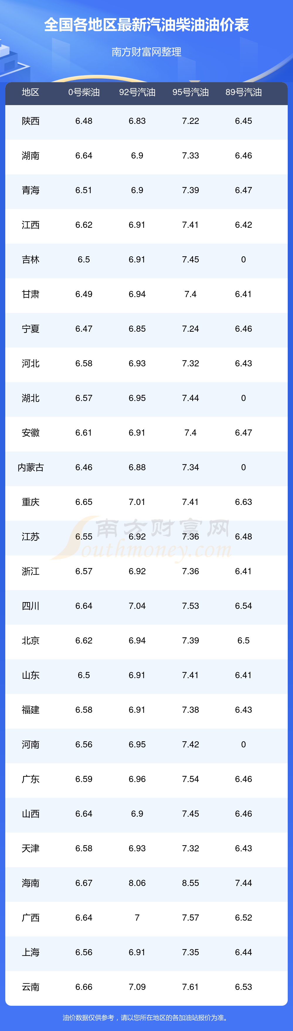 以上數(shù)據(jù)僅供參考,請以您所在地區(qū)的加油站實(shí)際售價(jià)為準(zhǔn)。南方財(cái)富網(wǎng)發(fā)布此信息的目的在于傳播更多信息,對使用該油價(jià)信息所導(dǎo)致的結(jié)果概不承擔(dān)責(zé)任。
