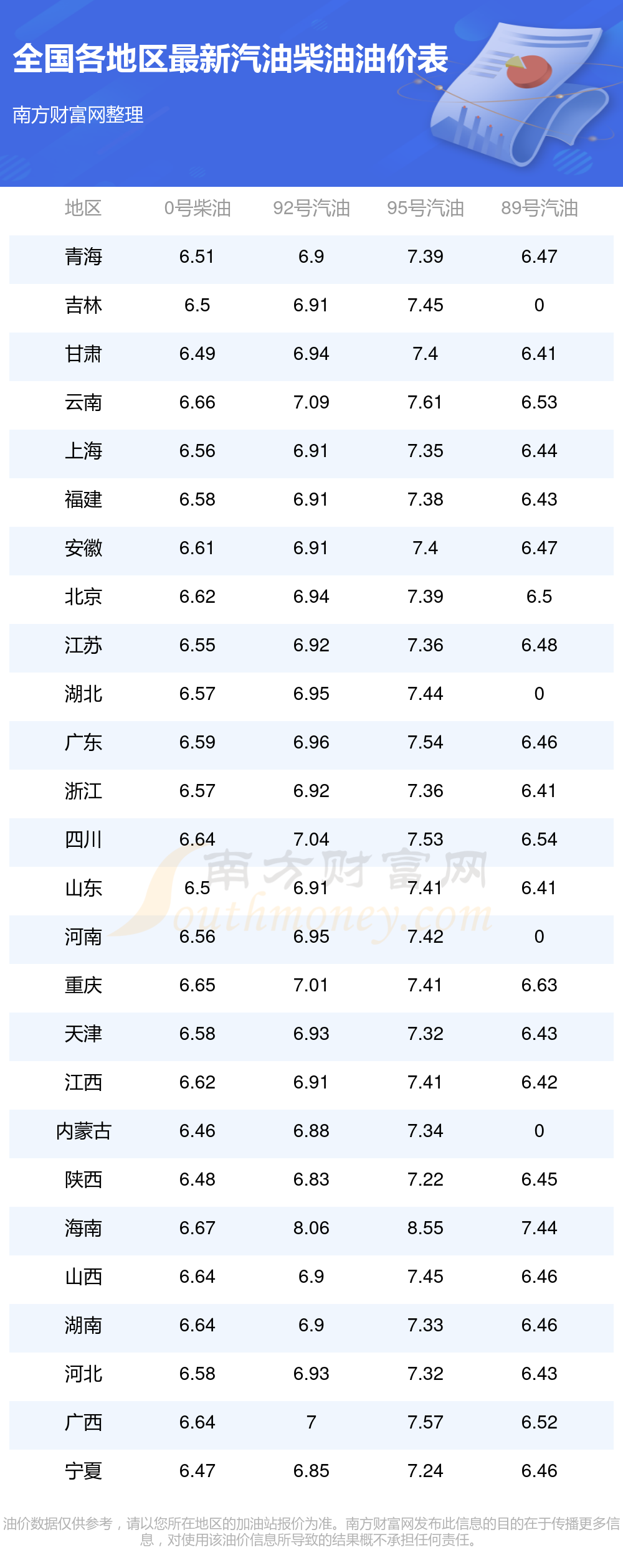 以上數(shù)據(jù)僅供參考,請以您所在地區(qū)的加油站實際售價為準。南方財富網發(fā)布此信息的目的在于傳播更多信息,對使用該油價信息所導致的結果概不承擔責任。