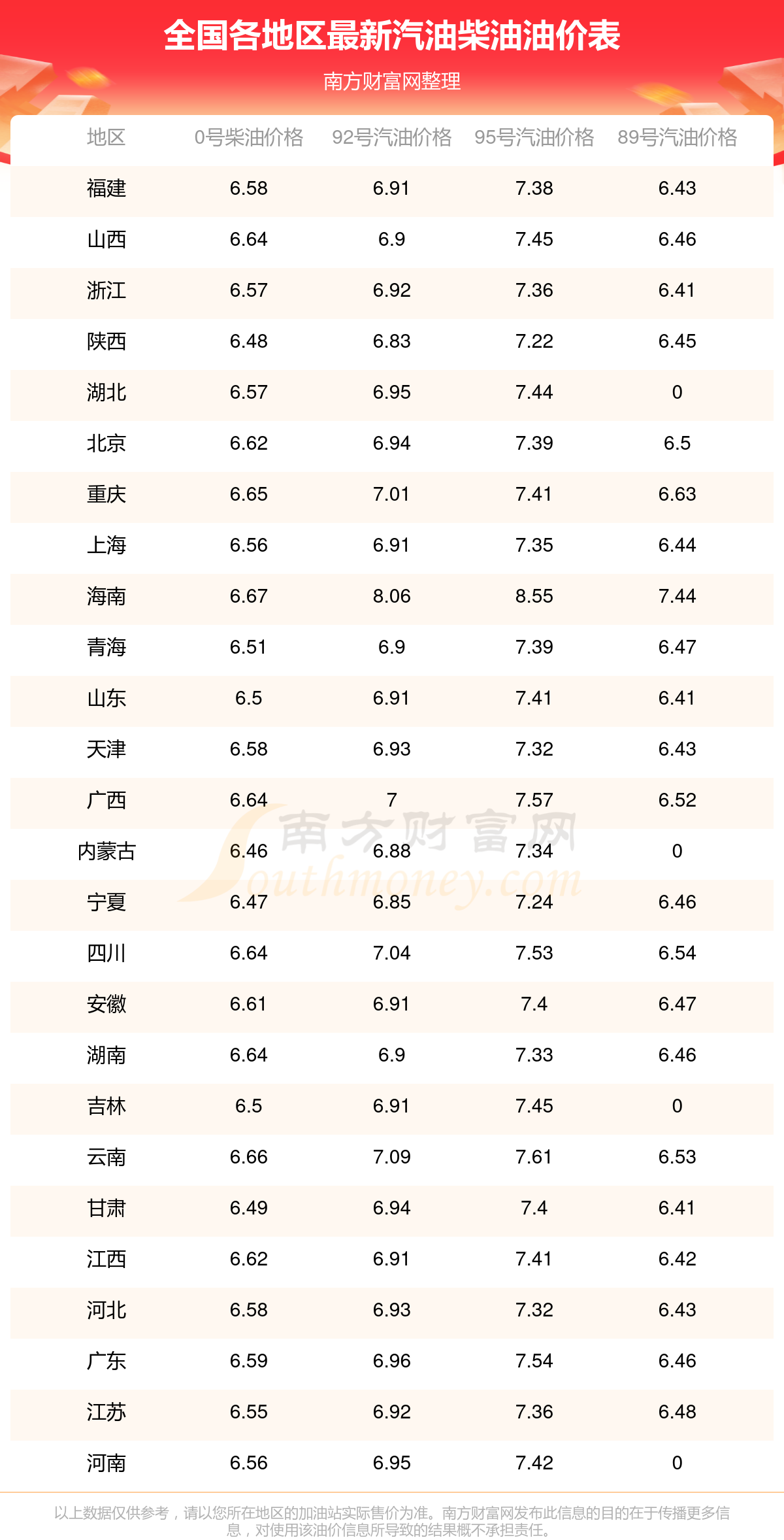 全國各地區(qū)最新油價表