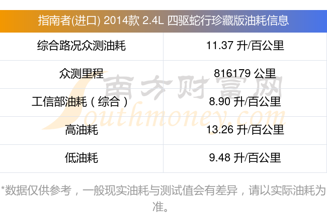 根據(jù)多位車主實測得出數(shù)據(jù),該車型低油耗為9.48升/百公里,高油耗為13.26升/百公里,綜合路況眾測油耗為11.37升/百公里,工信部綜合油耗為8.90升/百公里。