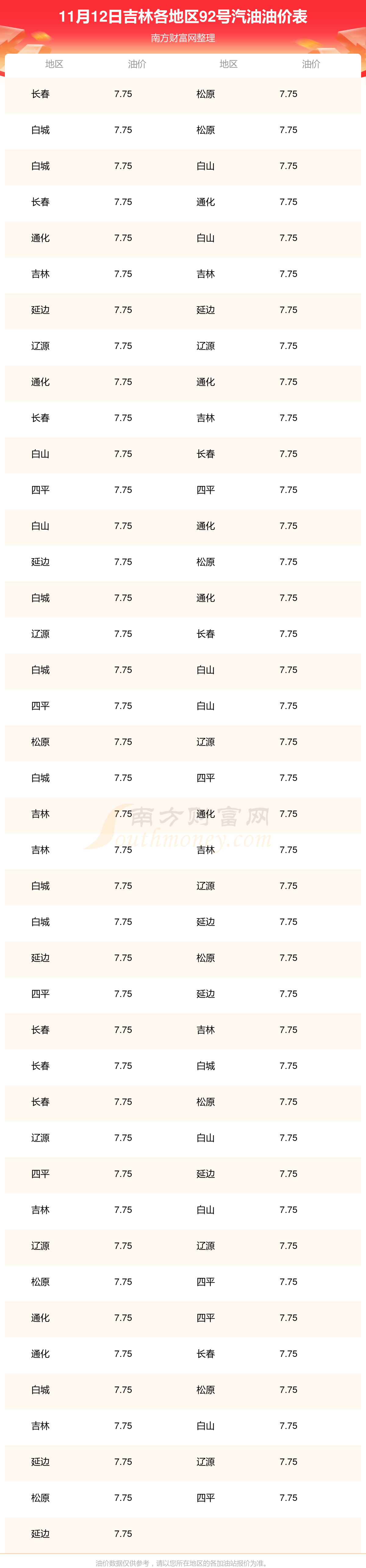 2025年11月12日吉林92號汽油最新價(jià)格一覽表