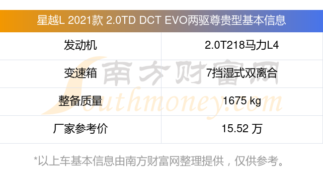 星越L 2021款 2.0TD DCT EVO兩驅(qū)尊貴型動力上搭載的是一臺2.0T218馬力L4渦輪增壓發(fā)動機,匹配7擋濕式雙離合自動檔變速箱,燃料形式為汽油,常規(guī)整備質(zhì)量1675kg,廠家參考價15.52萬元。