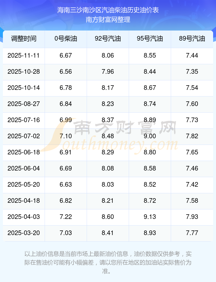 2025年海南三沙南沙區(qū)汽油價(jià)格一覽表