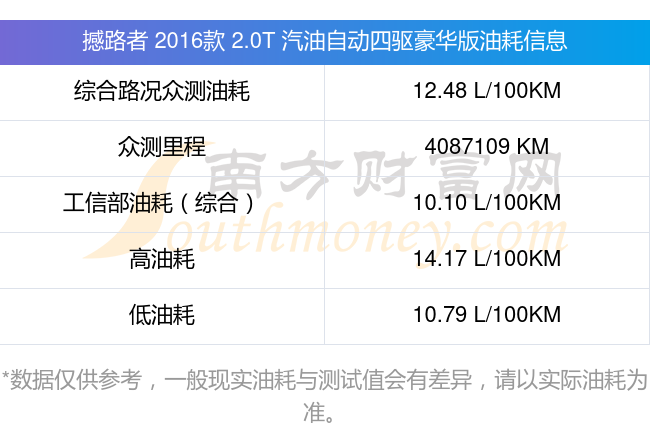 根據(jù)多位車主實(shí)測得出數(shù)據(jù),該車型低油耗為10.79L/100km,高油耗為14.17L/100km,綜合路況眾測油耗為12.48L/100km,工信部綜合油耗為10.10L/100km。