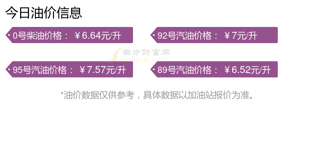 以上油價(jià)信息是當(dāng)前市場(chǎng)上最新油價(jià)信息,油價(jià)數(shù)據(jù)僅供參考,實(shí)際在售油價(jià)可能有小幅偏差,請(qǐng)以您所在地區(qū)的加油站實(shí)際售價(jià)為準(zhǔn)。