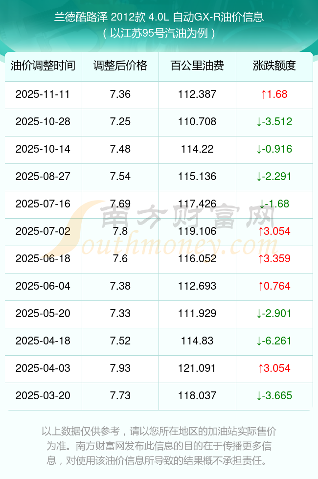 依照11月11日95號汽油最新調(diào)整價(jià)格7.36元/升來計(jì)算(以江蘇為例),該車型百公里的平均油費(fèi)是112.387元,依照上一輪10月28日調(diào)整價(jià)格7.25元/升來計(jì)算,百公里的平均油費(fèi)是110.708元,對比上一輪多花1.68元,下一輪的油價(jià)調(diào)整時(shí)間11月24日24時(shí)。