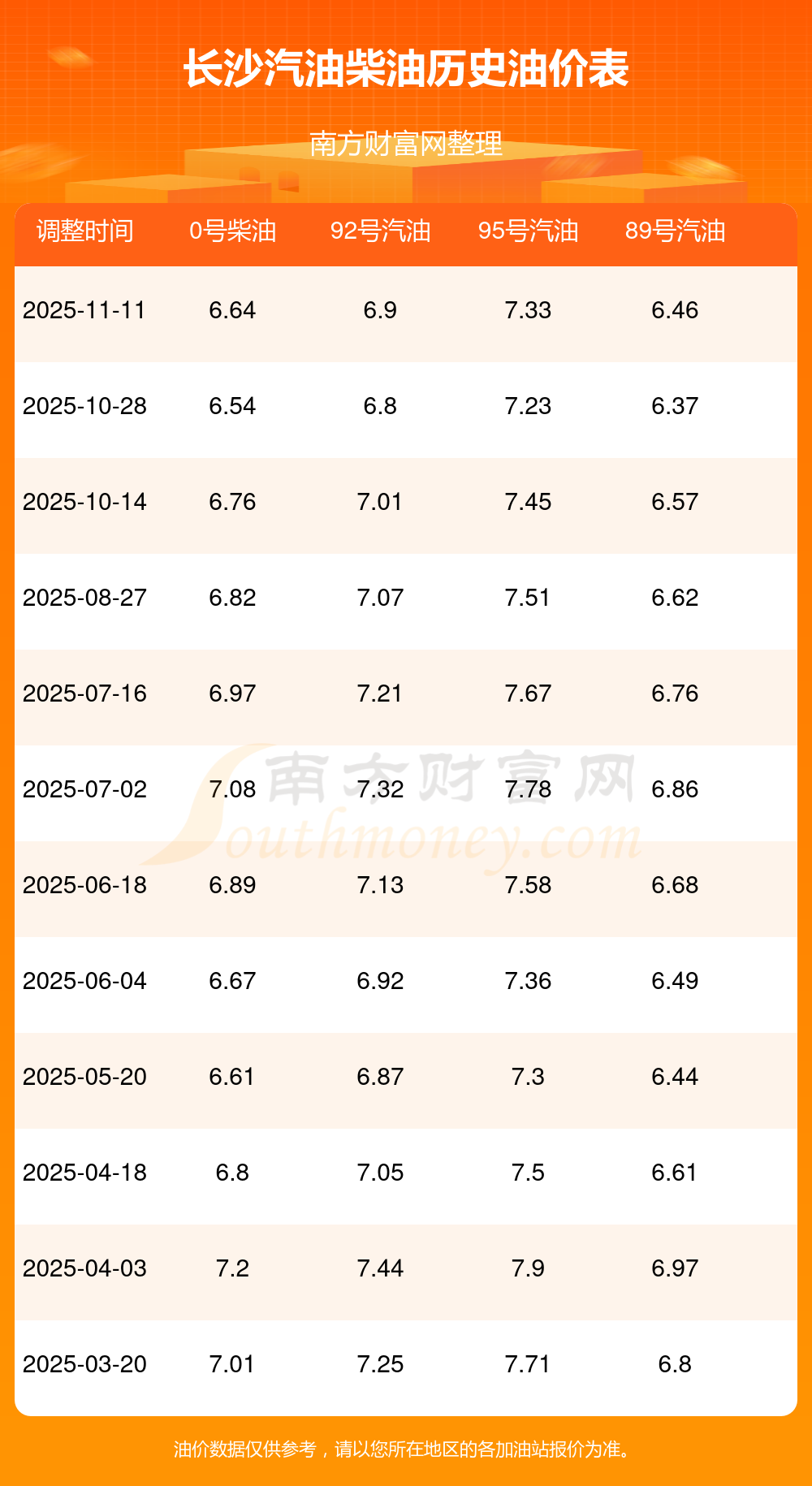 11月12日長沙汽油柴油每升的價格為11月11日調(diào)整后的價格,具體如下:92號汽油6.9元;95號汽油7.33元;89號汽油6.46元;0號柴油6.64元。