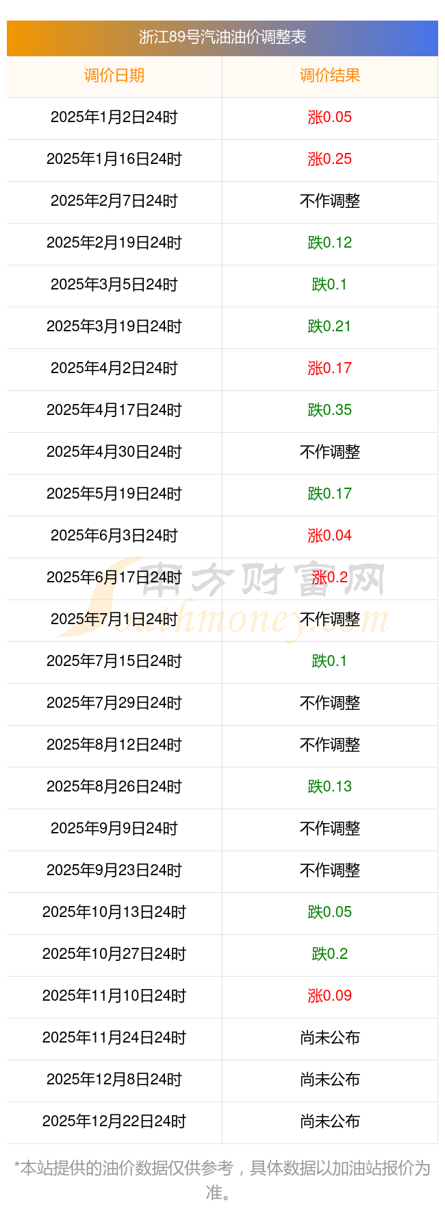 汽油、柴油11月12日每升的價格(油價調(diào)整時間11月11日):92號汽油6.92元;95號汽油7.36元;89號汽油6.41元;0號柴油6.57元。下一輪油價調(diào)整時間11月24日24時,距離現(xiàn)在還有12.59天。