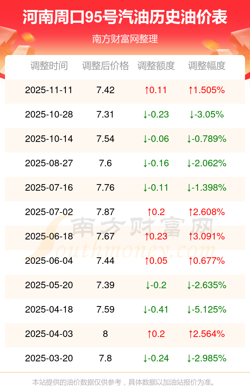 11月12日,河南周口95號(hào)汽油價(jià)格為每升7.42元,這是11月11日油價(jià)調(diào)整后的價(jià)格,相對(duì)上次調(diào)整時(shí)間10月28日的油價(jià)7.31元每升,上升了0.11元,上升1.505%。下一輪油價(jià)調(diào)整時(shí)間11月24日24時(shí),距離現(xiàn)在還有12.59天。