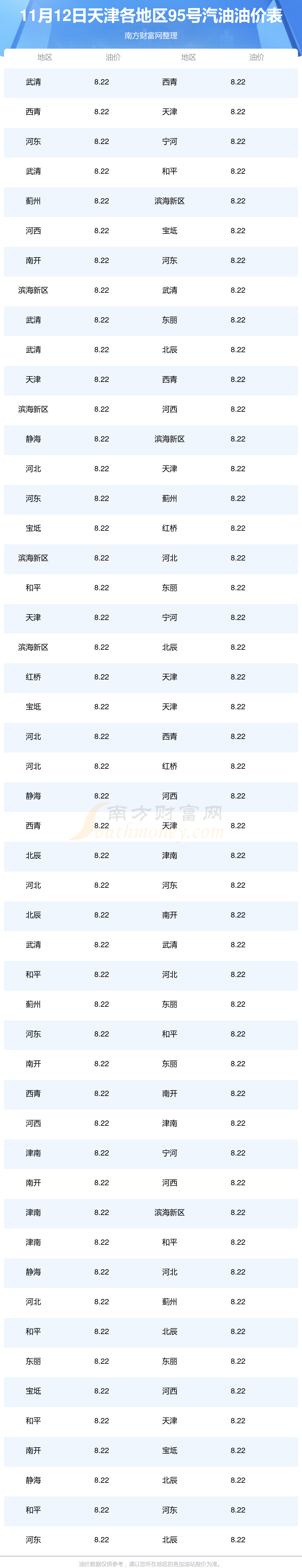 11月12日,天津95號汽油的價格是7.32元每升,本次的調(diào)整時間為11月11日,對比上次的調(diào)整上調(diào)了0.1元,上調(diào)1.385%,11月24日24時為下一輪油價調(diào)整時間,還有12.59天。