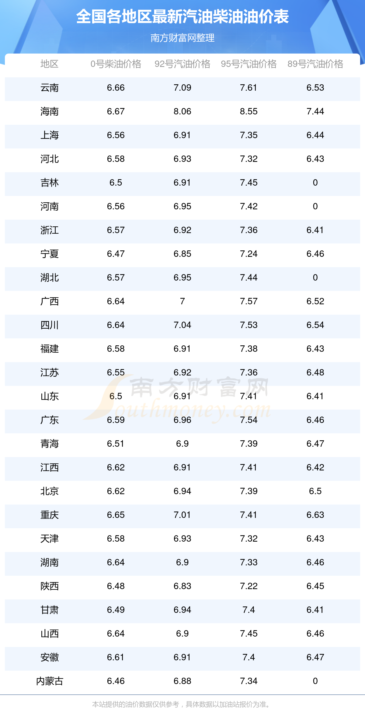 2025年11月12日全國(guó)各地汽油價(jià)格表一覽