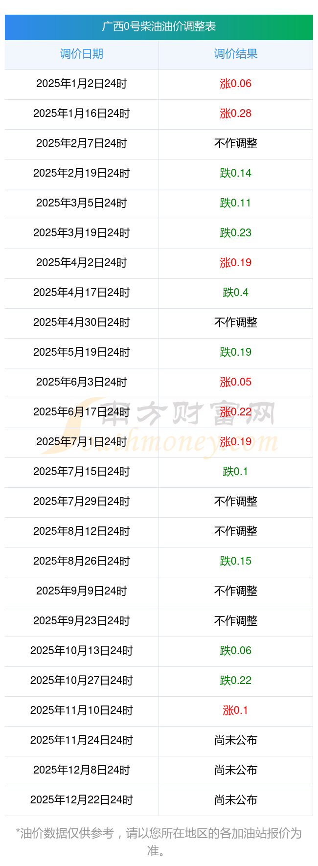 2025年廣西靖西油價(jià)調(diào)整日歷時(shí)間表