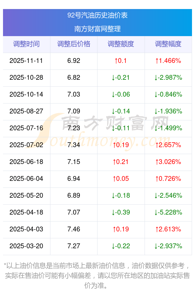 11月12日汽油、柴油的價(jià)格是11月11日調(diào)整后的價(jià)格,每升價(jià)格為:92號汽油為6.92元,升了0.1元,升幅達(dá)1.47%;95號汽油為7.36元,升了0.11元,升幅達(dá)1.52%;89號汽油為6.48元,升了0.09元,升幅達(dá)1.41%;0號柴油為6.55元,升了0.11元,升幅達(dá)1.71%。下一輪油價(jià)調(diào)整時(shí)間11月24日24時(shí),距離現(xiàn)在還有12.58天。