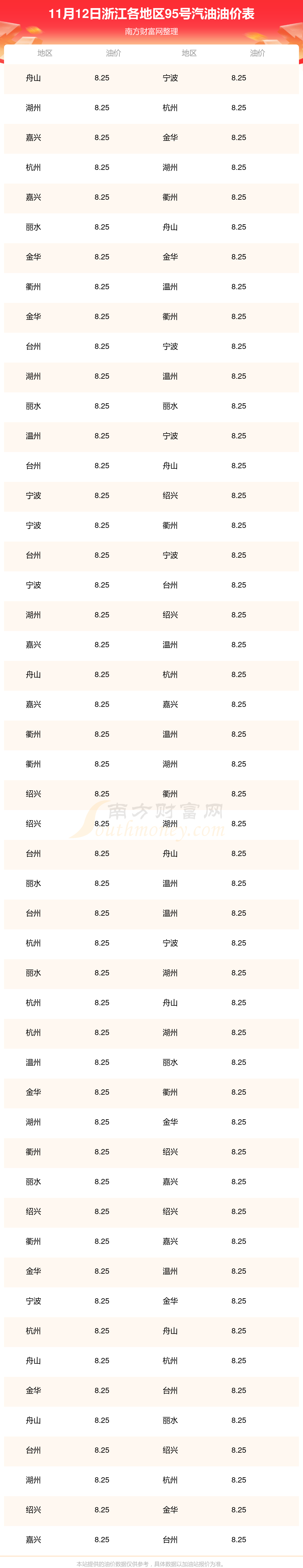 2025年11月12日浙江95號汽油最新價格一覽表