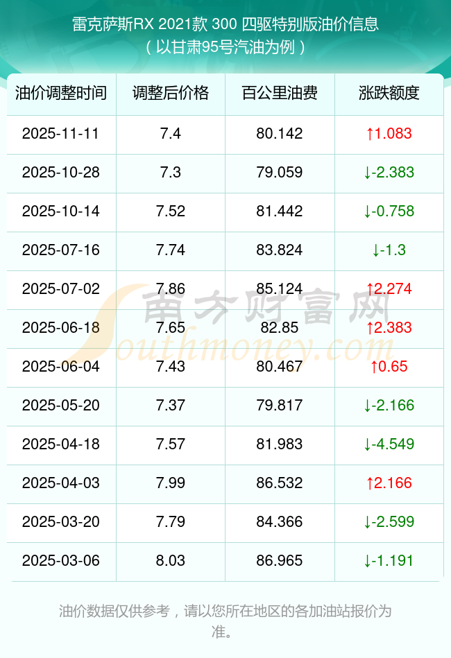 依照11月11日95號汽油最新調(diào)整價格7.4元/升來計算(以甘肅為例),該車型百公里的平均油費是80.142元,依照上一輪10月28日調(diào)整價格7.3元/升來計算,百公里的平均油費是79.059元,對比上一輪多花1.083元,下一輪的油價調(diào)整時間11月24日24時。