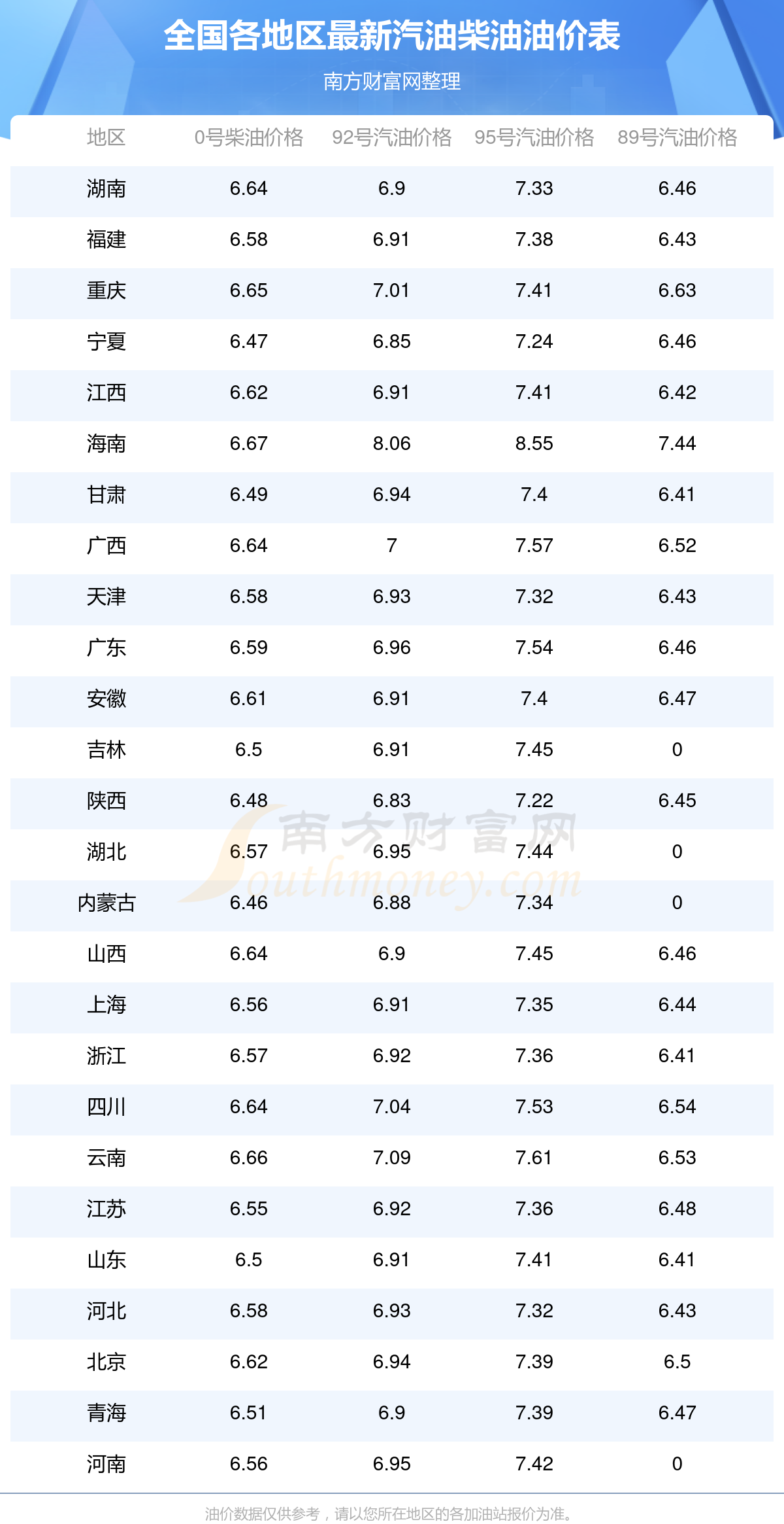 油價數(shù)據(jù)僅供參考,請以您所在地區(qū)的加油站報價為準(zhǔn)。南方財(cái)富網(wǎng)發(fā)布此信息的目的在于傳播更多信息,對使用該油價信息所導(dǎo)致的結(jié)果概不承擔(dān)任何責(zé)任。