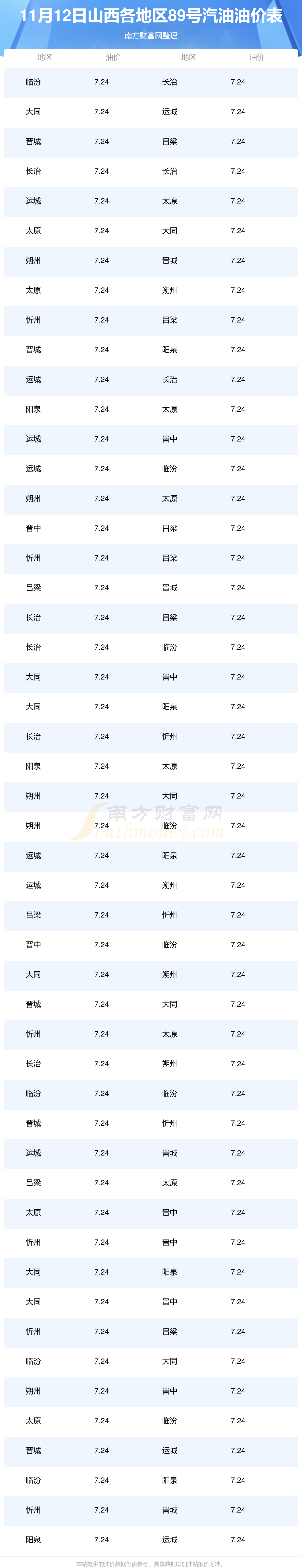 11月12日,山西89號汽油的價格是6.46元每升,本次的調整時間為11月11日,對比上次的調整升了0.1元,升1.572%,11月24日24時為下一輪油價調整時間,還有12.56天。