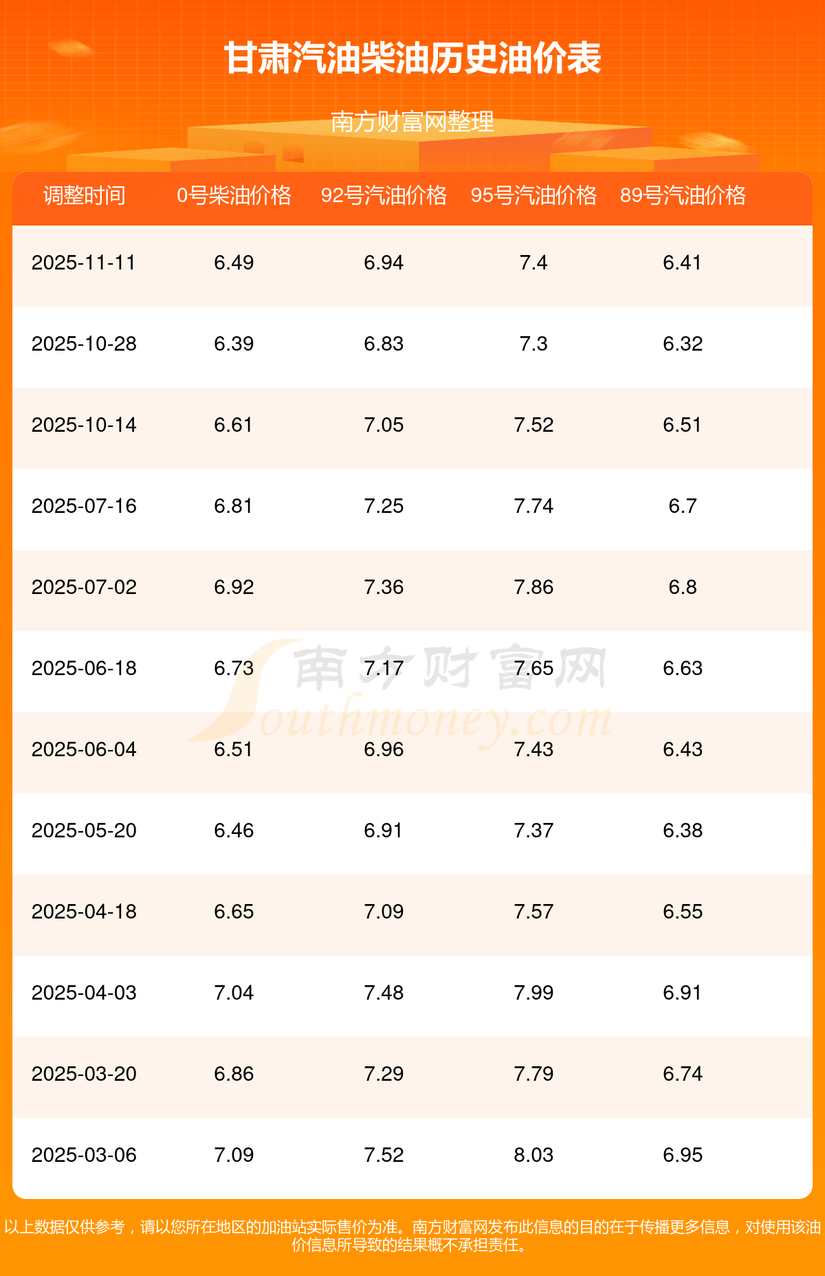 11月12日,甘肅0號(hào)柴油的價(jià)格是6.49元每升,本次的調(diào)整時(shí)間為11月11日,對(duì)比上次的調(diào)整升了0.1元,升1.565%,11月24日24時(shí)為下一輪油價(jià)調(diào)整時(shí)間,還有12.56天。
