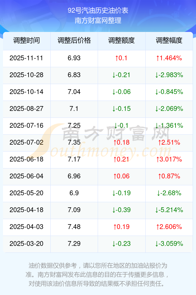汽油、柴油11月12日每升最新價格為:95號汽油為7.32元,上漲了0.1元;92號汽油為6.93元,上漲了0.1元;89號汽油為6.43元,上漲了0.1元;0號柴油為6.58元,上漲了0.11元,調(diào)整時間為11月11日。下一輪油價調(diào)整時間11月24日24時,距離現(xiàn)在還有12.56天。