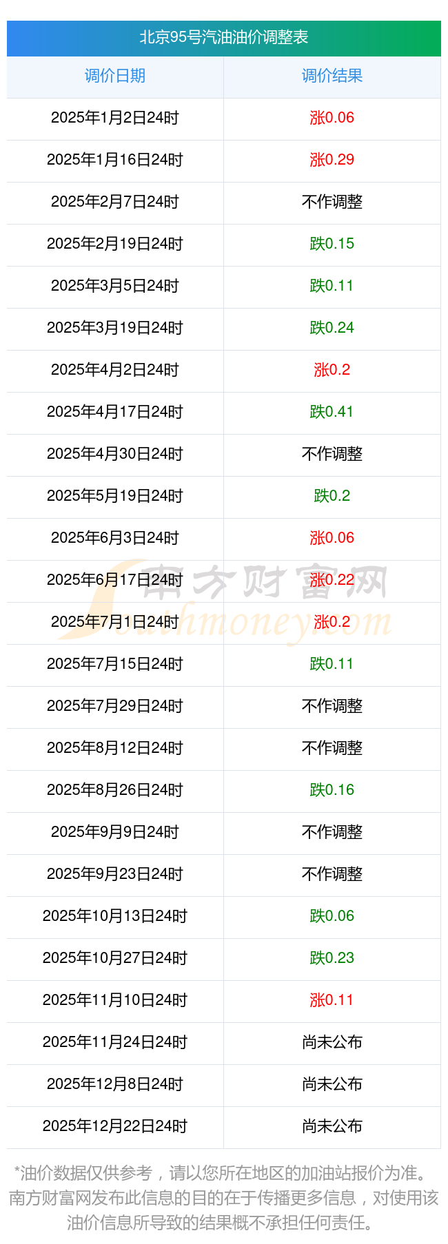 11月12日,北京95號汽油的價(jià)格是7.39元每升,本次的調(diào)整時(shí)間為11月11日,對比上次的調(diào)整增了0.11元,增1.511%,下次調(diào)整時(shí)間為11月24日24時(shí),還有12.55天。