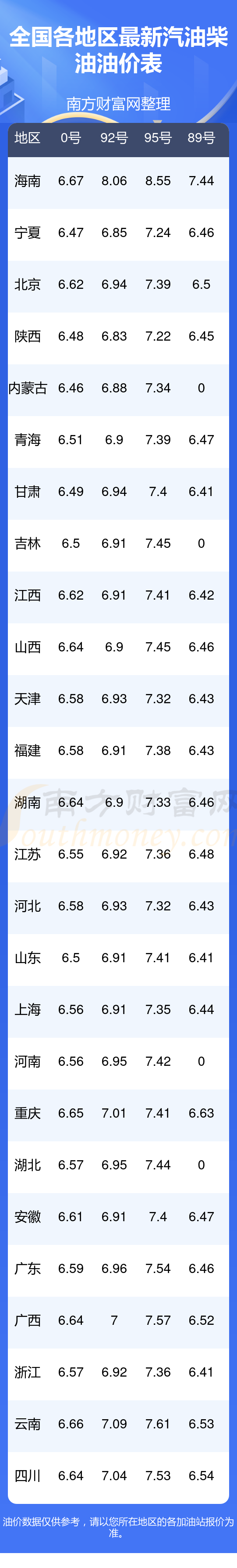 油價數(shù)據(jù)僅供參考,請以您所在地區(qū)的加油站報價為準。南方財富網(wǎng)發(fā)布此信息的目的在于傳播更多信息,對使用該油價信息所導(dǎo)致的結(jié)果概不承擔任何責任。