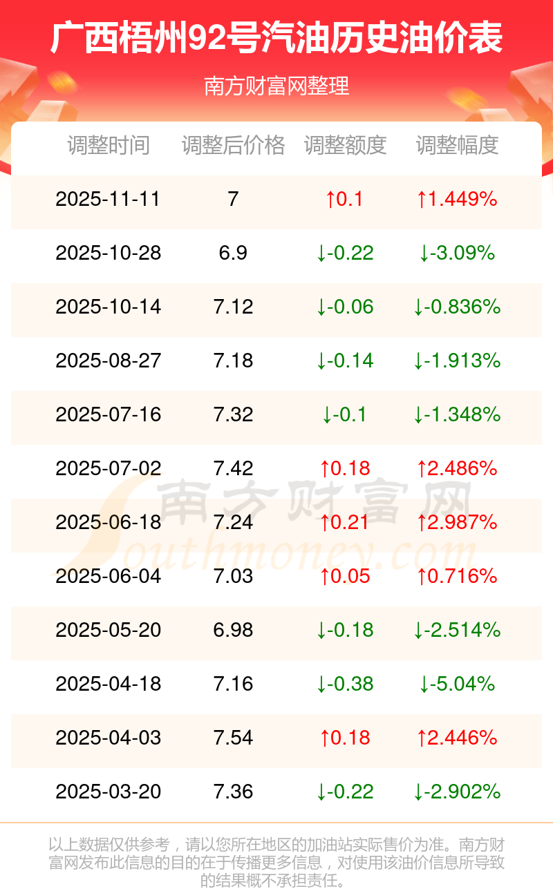 11月12日廣西梧州92號汽油的價格是7元/升(調(diào)整時間為11月11日),對比上次調(diào)整時間10月28日的油價6.9元/升,上漲了0.1元,上漲幅達1.449%。下一輪油價調(diào)整時間11月24日24時,距離現(xiàn)在還有12.54天。