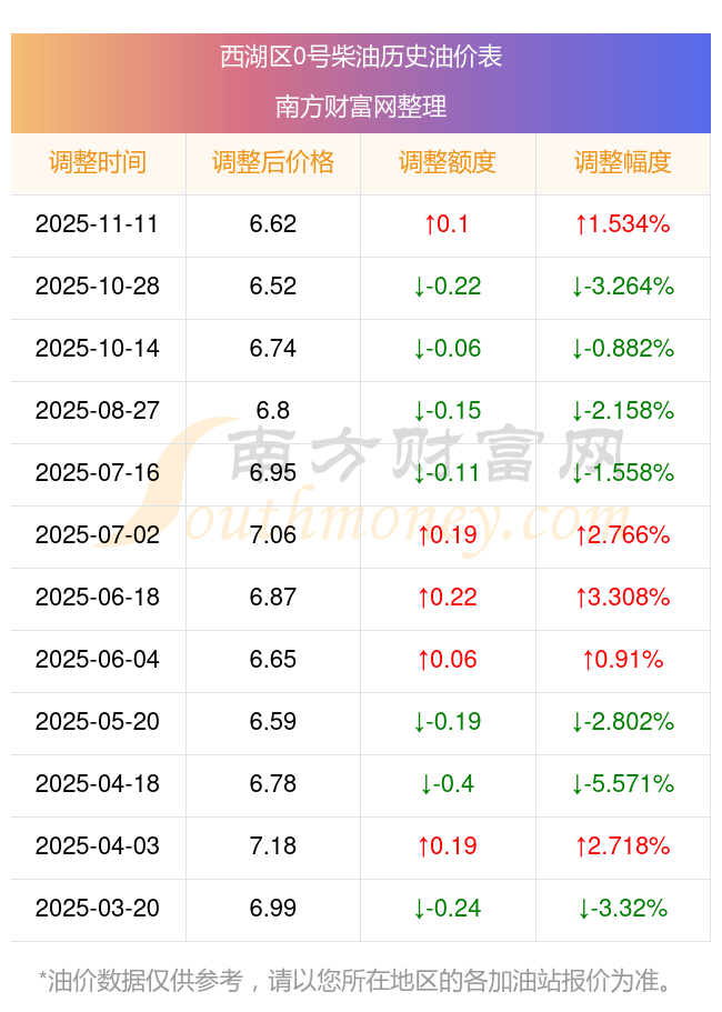 西湖區(qū)11月12日0號(hào)柴油歷史油價(jià)調(diào)整一覽表