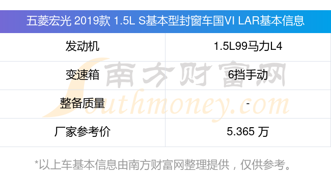 在動力上,五菱宏光 2019款 1.5L S基本型封窗車國VI LAR配備的是一臺1.5L99馬力L4自然吸氣發(fā)動機(jī),匹配的是6擋手動擋變速箱,燃料形式為汽油,廠家參考價5.365萬元。