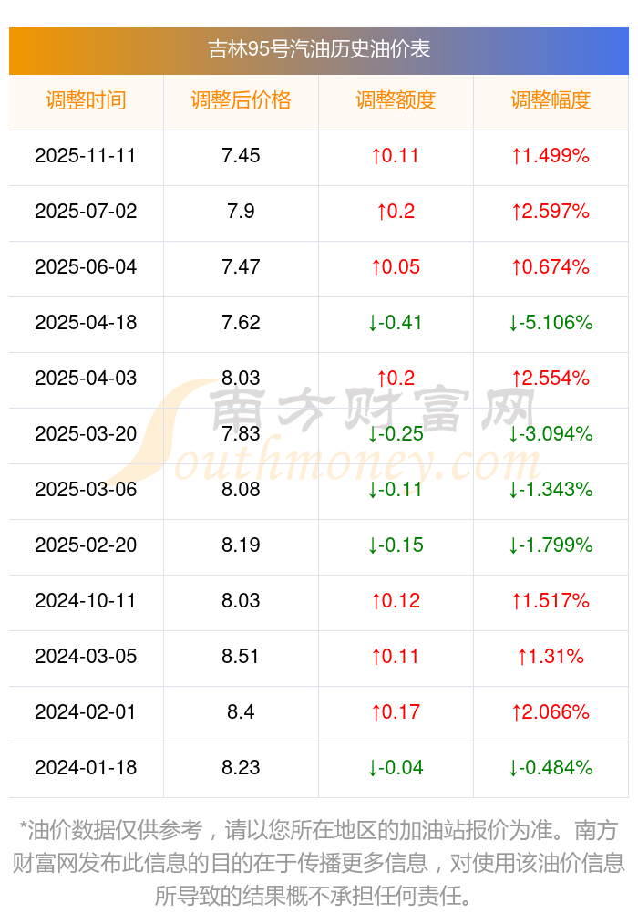 11月12日,吉林95號汽油的價(jià)格是7.45元每升,本次的調(diào)整時(shí)間為11月11日,對比上次的調(diào)整漲了0.11元,漲1.499%,下次調(diào)整時(shí)間為11月24日24時(shí),還有12.5天。