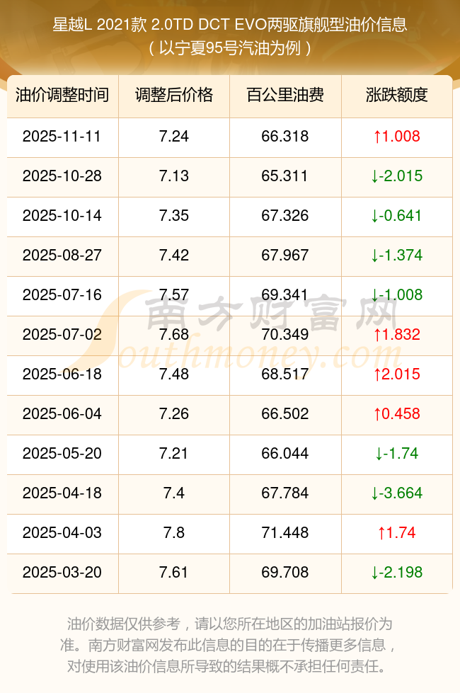 依照11月11日95號汽油最新調(diào)整價格7.24元/升來計算(以寧夏為例),該車型百公里的平均油費是66.318元,依照上一輪10月28日調(diào)整價格7.13元/升來計算,百公里的平均油費是65.311元,對比上一輪多花1.008元,下一輪的油價調(diào)整時間11月24日24時。