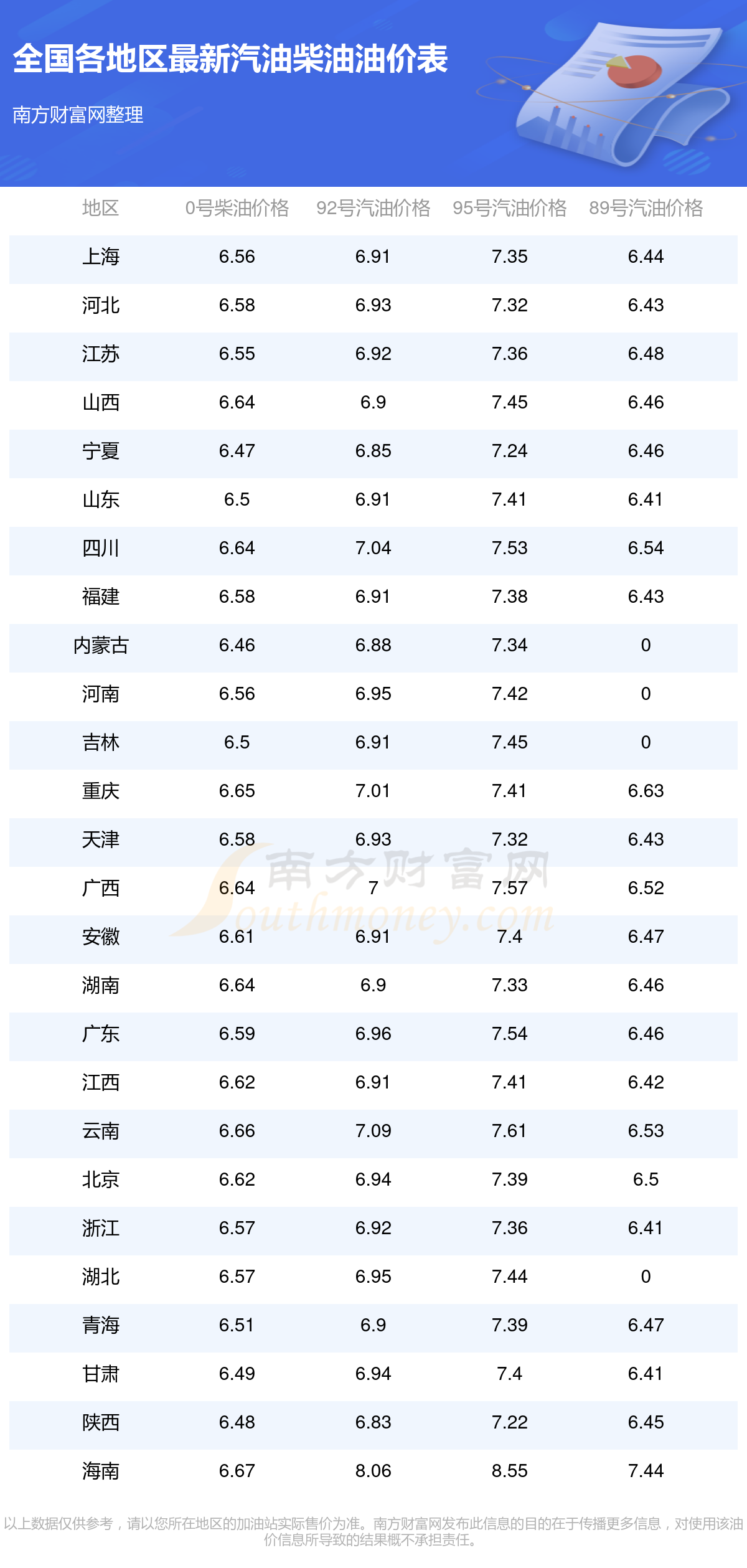 以上數(shù)據(jù)僅供參考,請以您所在地區(qū)的加油站實(shí)際售價(jià)為準(zhǔn)。南方財(cái)富網(wǎng)發(fā)布此信息的目的在于傳播更多信息,對使用該油價(jià)信息所導(dǎo)致的結(jié)果概不承擔(dān)責(zé)任。