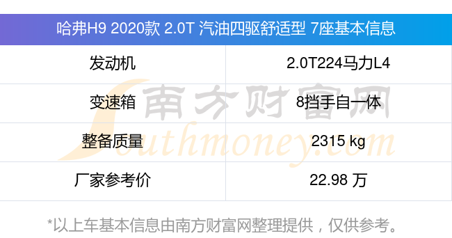 在動力方面,哈弗H9 2020款 2.0T 汽油四驅(qū)舒適型 7座搭載的是一臺2.0T224馬力L4渦輪增壓發(fā)動機,匹配8擋手自一體自動檔變速箱,燃料形式為汽油,常規(guī)整備質(zhì)量2315kg,廠家參考價22.98萬元。