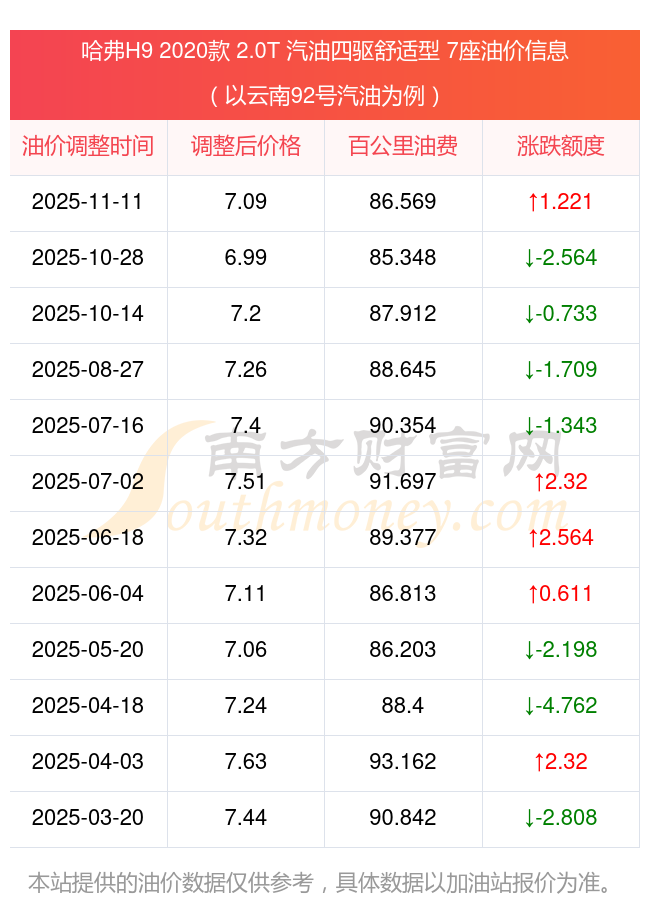 依照11月11日92號汽油最新調(diào)整價格7.09元/升來計算(以云南為例),該車型百公里的平均油費是86.569元,依照上一輪10月28日調(diào)整價格6.99元/升來計算,百公里的平均油費是85.348元,對比上一輪多花1.221元,下一輪的油價調(diào)整時間11月24日24時。