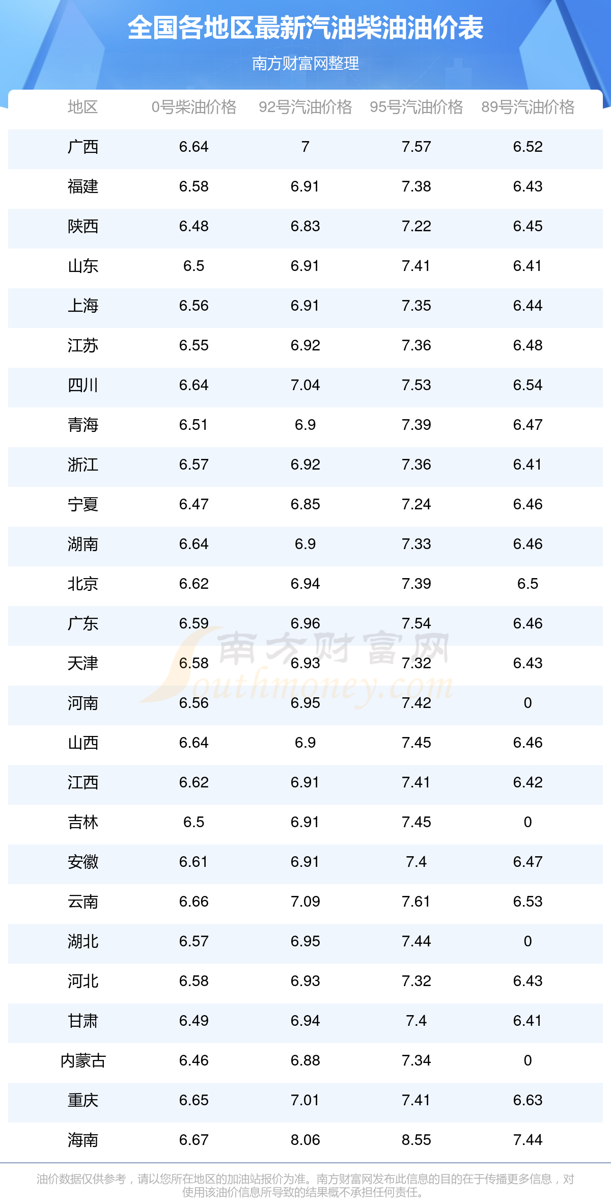 油價(jià)數(shù)據(jù)僅供參考,請(qǐng)以您所在地區(qū)的各加油站報(bào)價(jià)為準(zhǔn)。