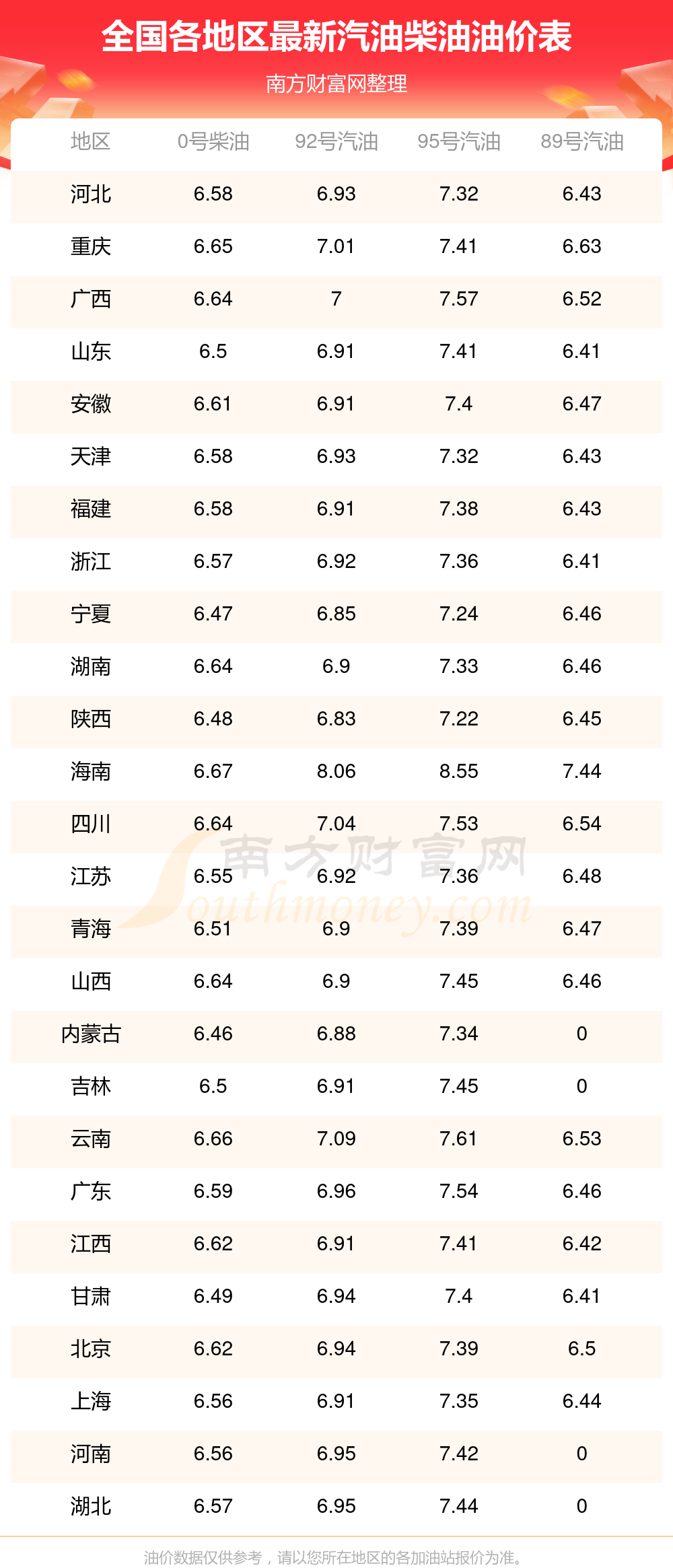 0號(hào)柴油平均價(jià)格:7元每升,其中,最高為海南,價(jià)格為6.67元/升,最低為內(nèi)蒙古,價(jià)格為6.46元/升。
