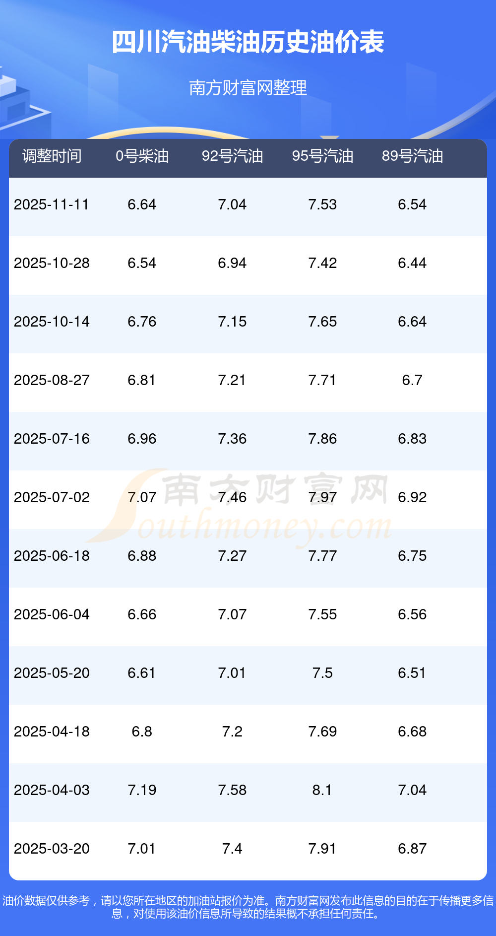 11月12日,四川89號汽油的價格是6.54元每升,本次的調(diào)整時間為11月11日,對比上次的調(diào)整上調(diào)了0.1元,上調(diào)1.553%,11月24日24時為下一輪油價調(diào)整時間,還有12.45天。