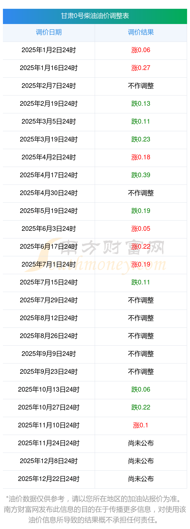 11月12日,甘肅0號柴油的價(jià)格是6.49元每升,本次的調(diào)整時(shí)間為11月11日,對比上次的調(diào)整漲了0.1元,漲1.565%,下次調(diào)整時(shí)間為11月24日24時(shí),還有12.44天。